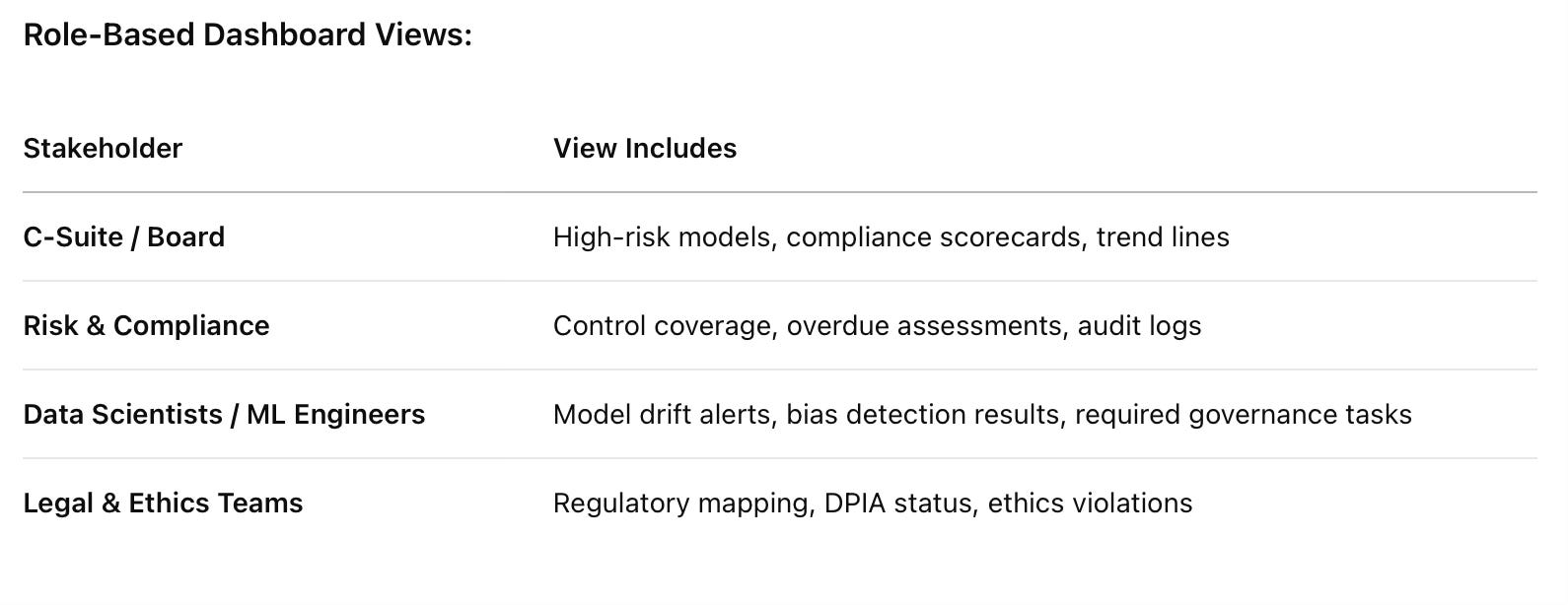 Not all users need the same level of detail. Executives need strategic insights; compliance teams need control status; data scientists need technical risk indicators.