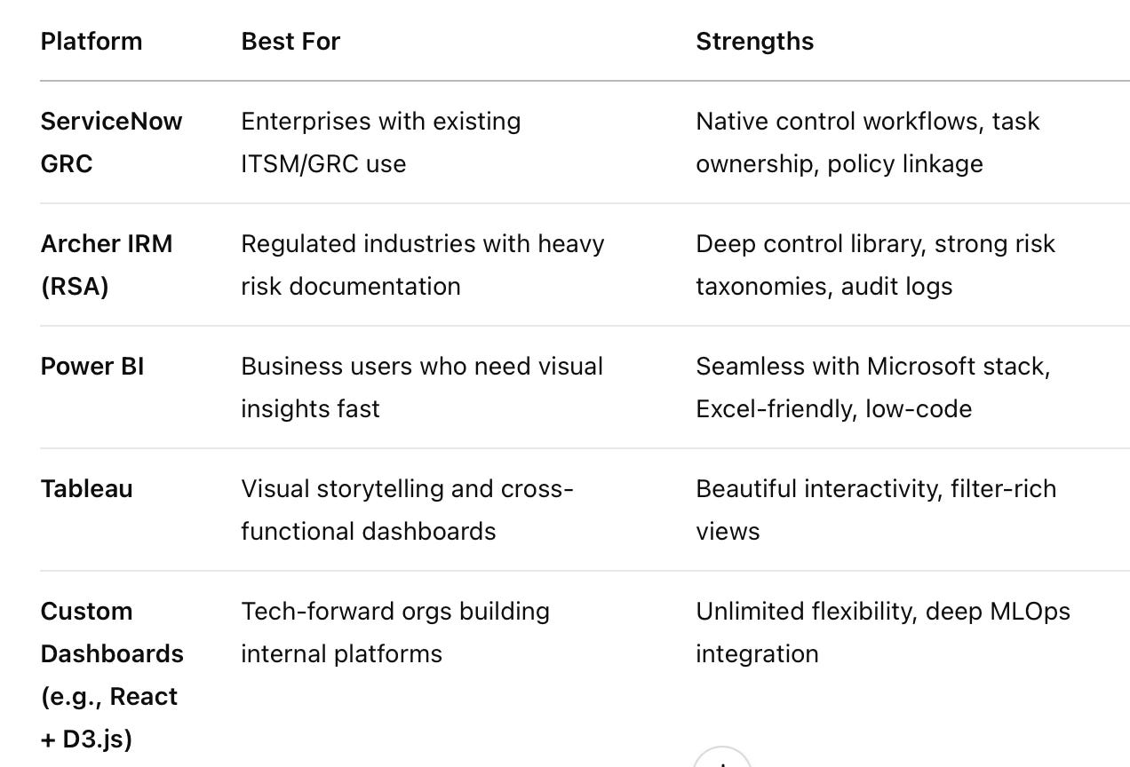 Your choice of dashboard platform should align with your organization's existing ecosystem, GRC maturity, and integration needs.