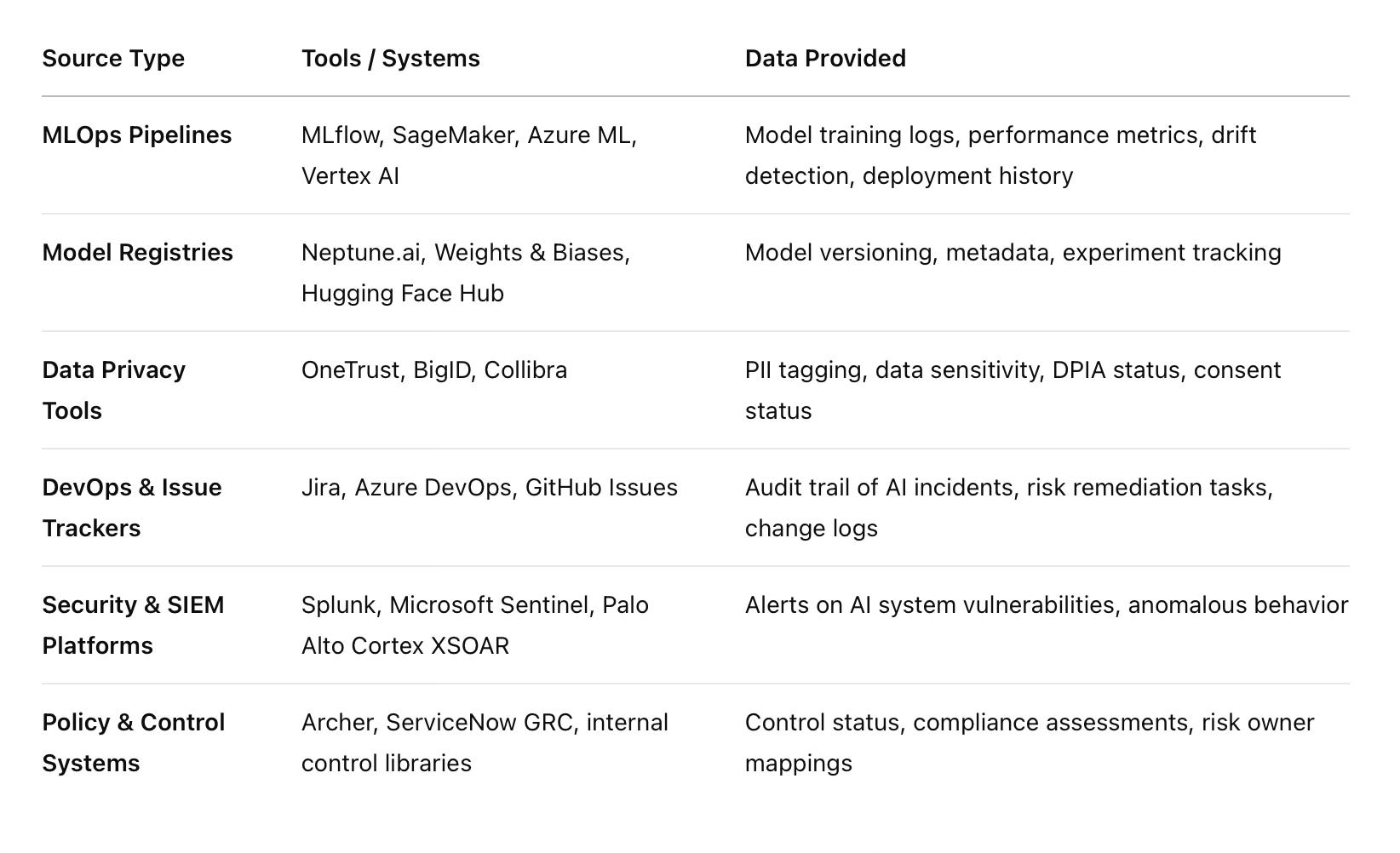 Leverage APIs and integrations to continuously pull data from ML Ops platforms (e.g., MLflow, SageMaker, Azure ML), issue trackers, and compliance tools.