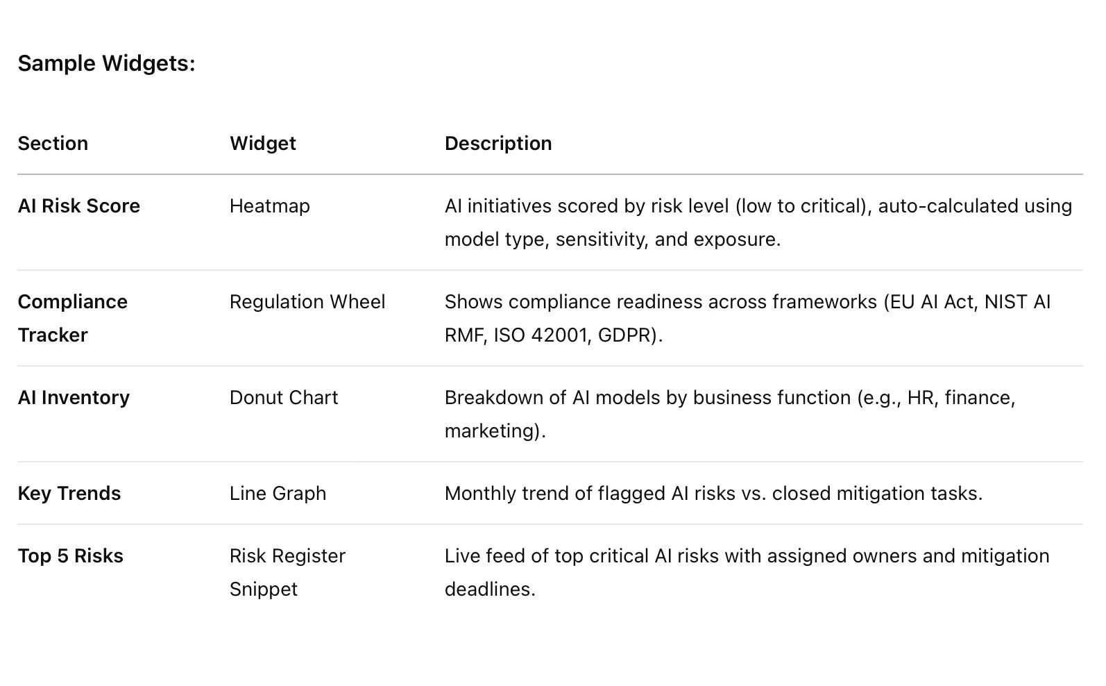 All three of these widgets elevate GRC from a checkbox exercise to a strategic command center for AI risk.