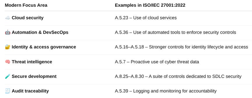 These updates make ISO/IEC 27001:2022 much more compatible with cloud-native, DevOps, and agile environments — where speed, automation, and continuous delivery are the norm.